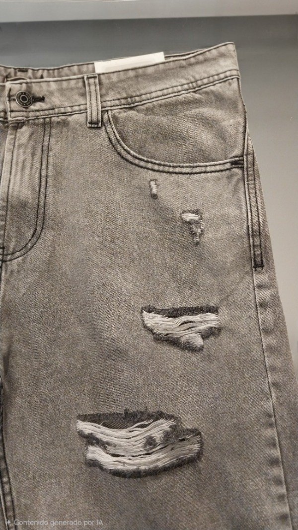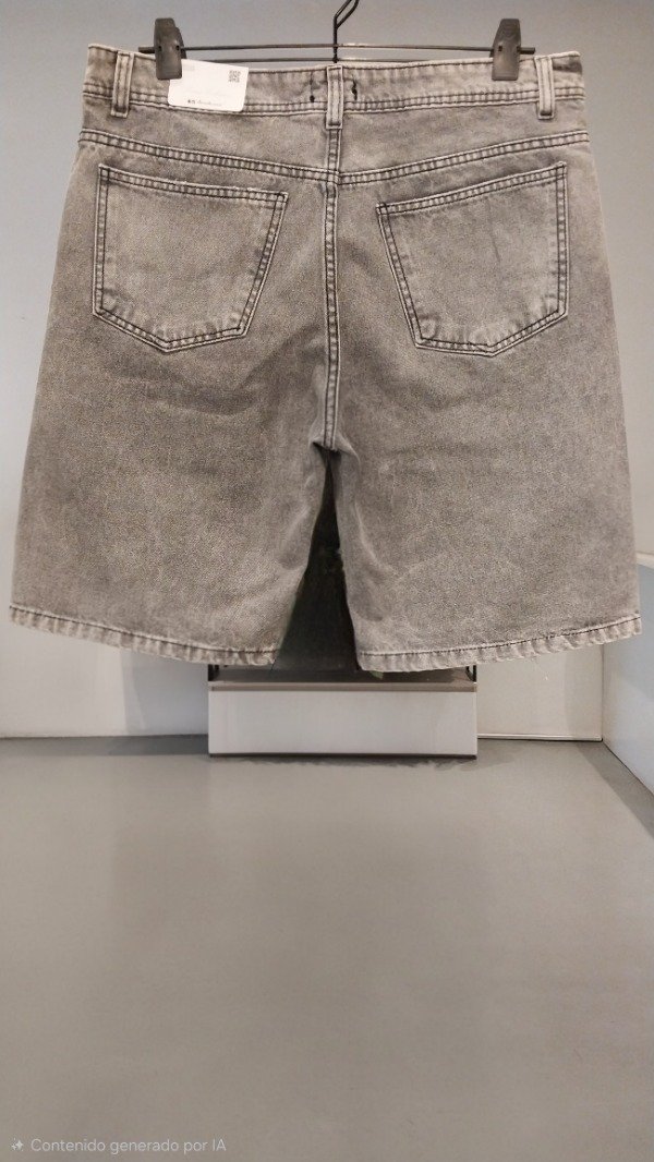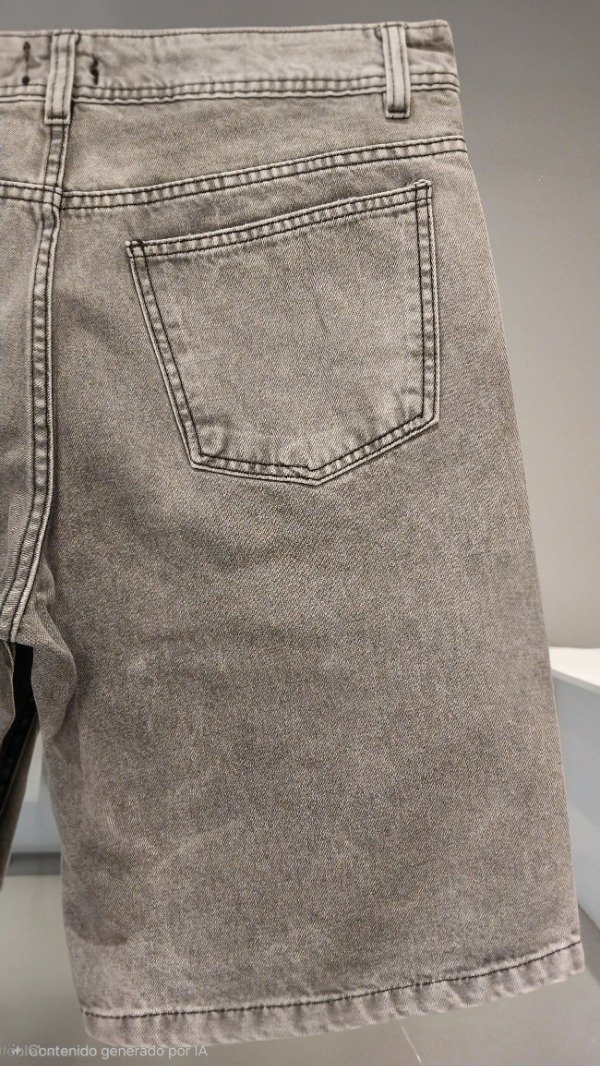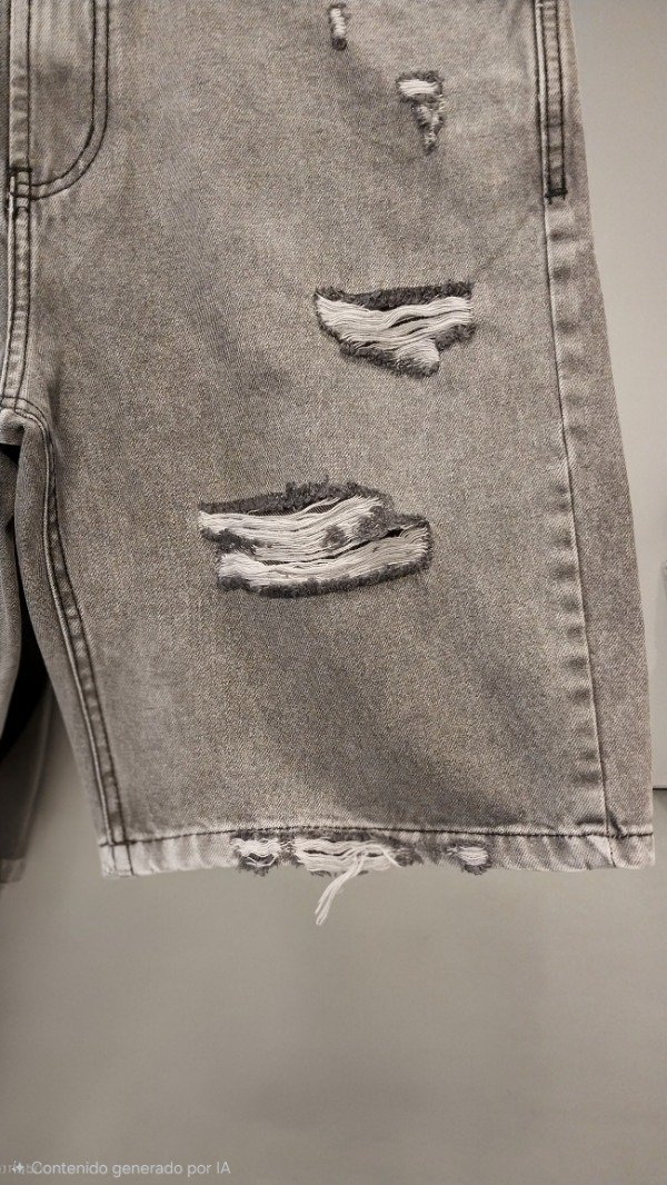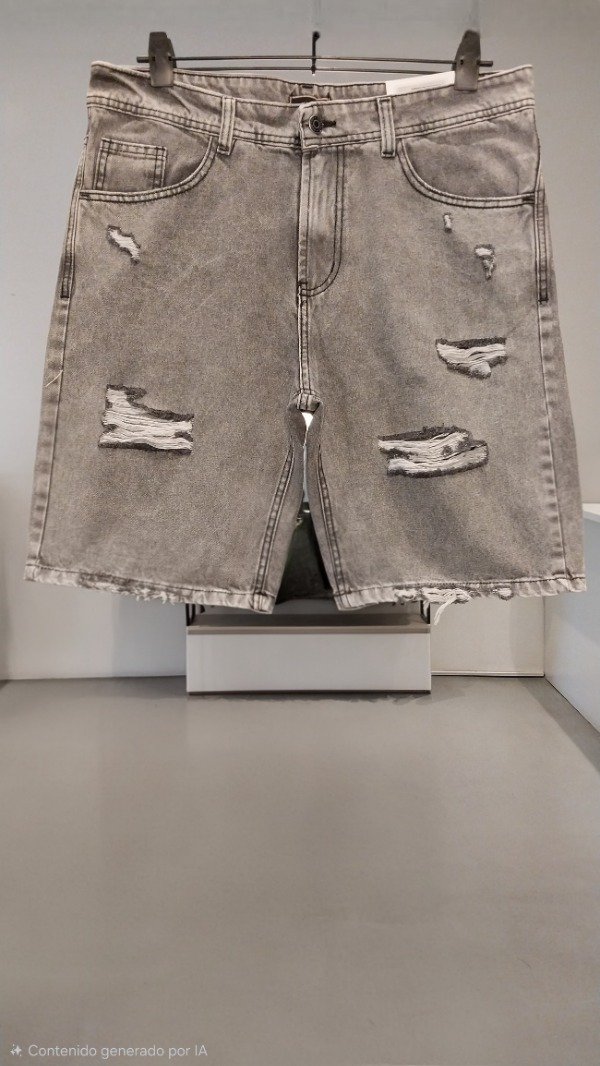 Estas Bermudas cortas de Jeans presentan un aspecto desgastado y envejecido, logrado mediante un proceso de lavado a la piedra que acentúa las costuras y pliegues naturales del material. El diseño incorpora detalles distressed, con roturas estratégicamente ubicadas en la parte frontal y un borde inferior deshilachado para un estilo urbano y moderno.
